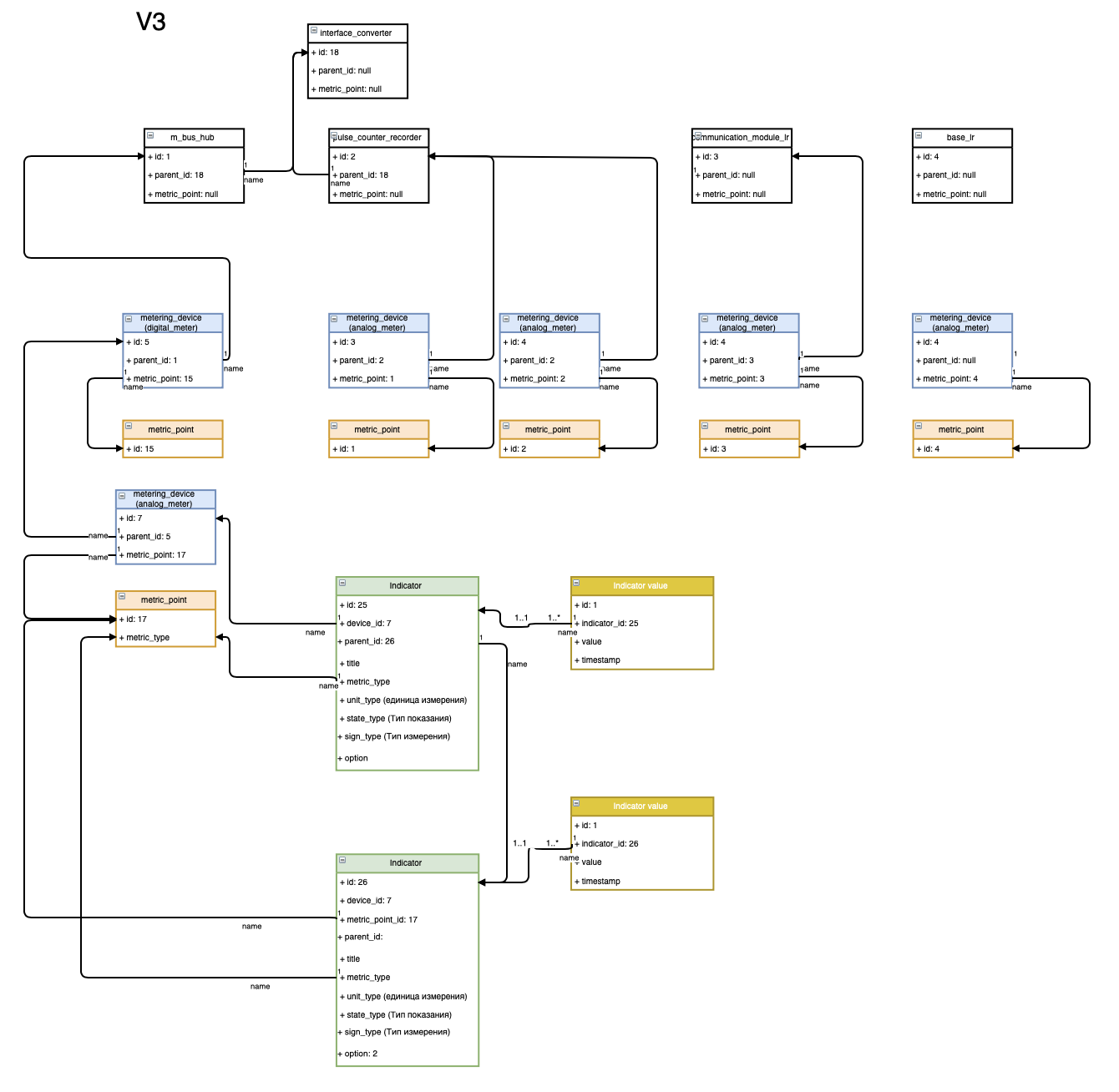 Основной объект (Device) описывает в зависимости от типа (DeviceType) счетчик (metering_device) или оборудование, необходимое для организации канала связи до счетчика, например, конвертор интерфейсов RS-485/Ethernet (interface_converter). Зависимость счетчика от оборудования связи представлена в виде стуктуры "родитель-потомок" (в поле parent_id содержится ссылка на родителя). Родителем выступает конечный(самый последний device), при этом, счетчик, будет самым последним потомком. Счетчик (metering_device) включает в себя Точку учета (Metric_Point) и массив Индикаторов (Indicator) - каналов измерения прибора учета.
